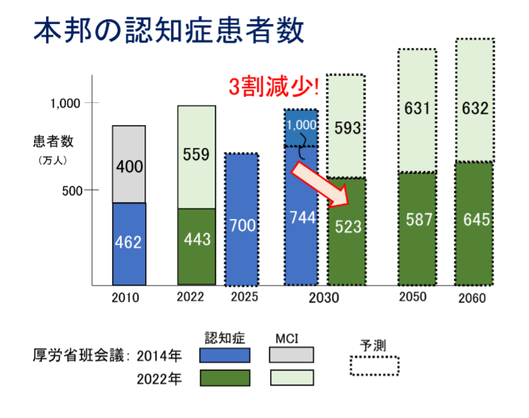 厚生労働省の班会議が、現在の認知症患者数と将来予測について、2014年と2022年に報告している。2014年の報告では、2010年の時点で我が国には認知症患者が 462万人、認知症予備群と言われる軽度認知障害 (MCI) の患者が 400万人おり、認知症患者は 2025年には 700万人、2030年には 744万人から最大 1,000万人に膨れ上がると予想された。この報告が出るまで、「現在の認知症患者数は 200万人で、将来の最大が 400万人」と言われていただけに、すでに最大数を超えているという現状に、世間は騒然となった。