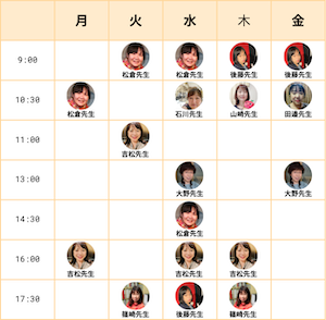 今週の「音会なかま紹介」では、現在開講している週1回クラスの時間割を、担当の先生のお顔写真とお名前とともに一覧にしました。
