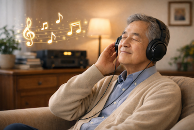 今回、多人数を対象とした追跡調査でこのことを明らかにした研究が、オーストラリアのメルボルンの大学のグループから発表された(Jaffa E, Int J Geriatr Psychiatry, 2025)。70歳以上で、認知症ではない高齢者10,893名について、音楽聴取、楽器演奏、あるいはその両方の活動と、認知症や軽度認知障害 (MCI) の発症リスクとの関係を、3年目以降に調査した。その結果、それらの活動をまったく行わないひとにくらべ、音楽を常に聴く習慣のあるひとは、認知症のリスクを39%、MCIのリスクが17%低下していた。楽器の演奏を頻繁に行うひとは、認知症のリスクが35%減少した。著者は以上より、「音楽活動は認知症予防のためにアクセスしやすい方法 (accessible strategy)」と結論づけている。