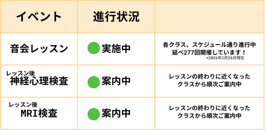 1番最初にスタートいたしました水曜日16:00のクラスは、昨日をもって最後のレッスンとなりました。休まず全回ご出席くださった方もいらっしゃり、心より御礼申し上げます。この後順次、神経心理検査およびMRI検査を受けていただきます。音会レッスンの前後でどのような変化がみられるのかを調べる非常に大事な検査となりますので、よろしくお願いいたします。